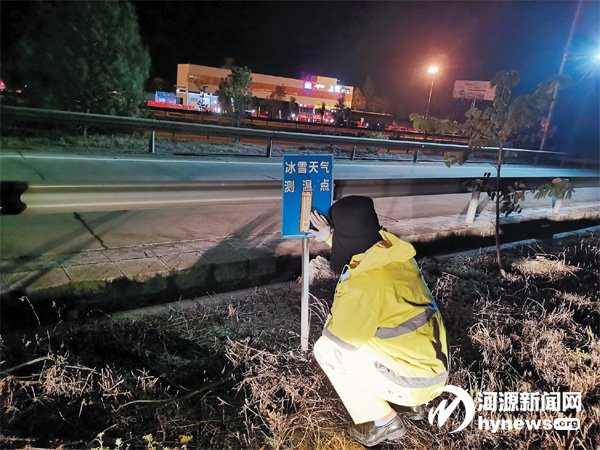 和平路政中隊老班長鄭生平在戰“疫”的同時,主動承擔起了氣溫監測工作。“在返粵復工的關鍵時刻,路面結冰極易影響交通,疫情防控是首要,但道路安全同樣重要。”鄭生平介紹,為了隨時監測天氣,每天深夜他們都駐守在氣溫最低的監測點,完成每小時一測工作。