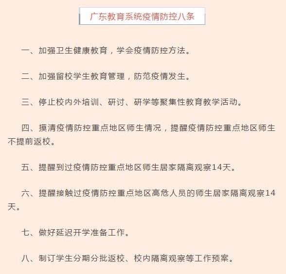 記者獲悉,近期,廣東省教育廳落實國家和省對新型冠狀病毒感染的肺炎疫情防控工作部署,作出系列工作安排,整理出“廣東教育系統疫情防控八條”。