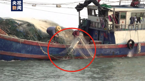 江蘇鹽城漁民 王鎖:當(dāng)初我們正在起網(wǎng),起網(wǎng)時(shí)候起錨起到一半的時(shí)候,忽然發(fā)現(xiàn)下面很沉,有點(diǎn)起不動(dòng)的感覺。