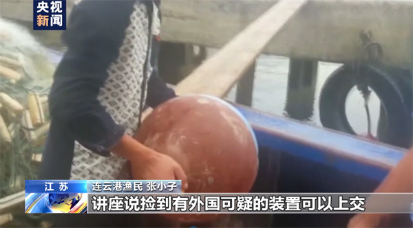 連云港漁民 張小子:起網(wǎng)看到前面有一個(gè)球形的東西,也不知道什么,就撈上來一看,上面還有外國(guó)字。講座說撿到有外國(guó)可疑的裝置可以上交,我們船上有衛(wèi)星電話,就打電話聯(lián)系,國(guó)家還給了獎(jiǎng)勵(lì)。