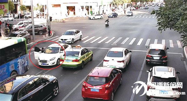 韋某某經歷片刻驚愕之后,拼命將身子往座位內側挪動,同時扣住安全帶試圖掙脫抓捕,并大喊司機趕緊開車。白色車輛直接加速,從長安街往河源大道方向一路狂奔逃竄。記者從路面監控視頻見到,一邊車門打開的白色小轎車在車流中加速行駛、不斷變道超車,打開的車門甚至險些撞上同向行駛的公交車。