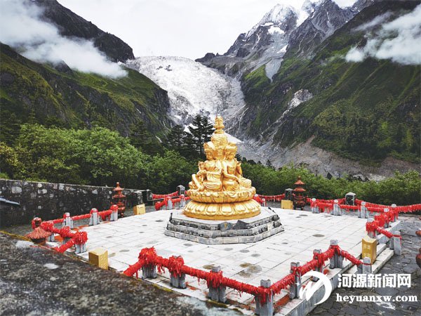 再往上走,正對著冰瀑的地方有一座泰式木亭和兩座四面佛,周圍鮮花環(huán)繞,這讓我想起泰國曼谷那萬人朝拜的四面佛;路邊還有一座白塔和藏民用石塊堆疊的無數(shù)個小瑪尼堆。在冰川上見到這些,似乎見到了信仰的力量。
