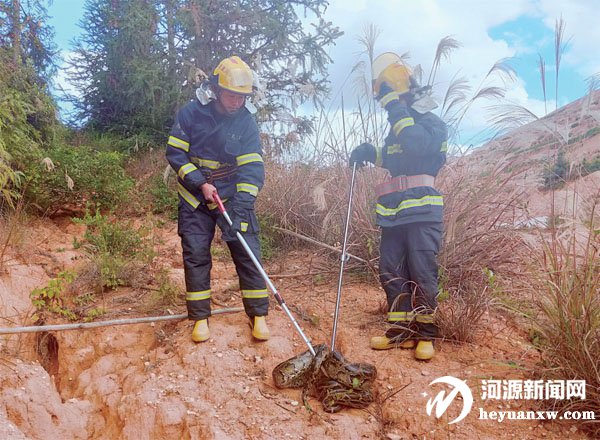 近日,紫金縣消防救援大隊接到119指揮中心報警,稱紫金縣敬梓鎮中聯村赤嶺茶莊發現一條大蟒蛇。紫金縣消防救援大隊到達現場后,發現一條重約38斤的大蟒蛇盤旋在養殖場附近半山坡上。兩名消防員穿戴好防護裝備后使用捕蛇器相互配合進行抓捕,合力將蛇控制住,并放入事先準備好的編織袋中。隨后,消防員將蛇帶到野外放生。