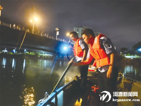 時間就是生命,曾運奎深知溺水者救援黃金20分鐘的緊迫性。接警后,他立即帶領隊員趕往現場。當曾運奎趕到現場時,漆黑的水面上沒有發現落水者的身影。“快!大家分散在周圍水域快速搜尋——”曾運奎話音未落,兩艘沖鋒舟立即沿新豐江水域往下開展搜救。