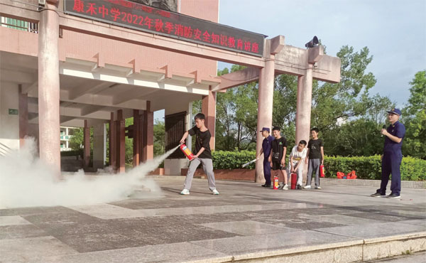 活動中,學校教師配合康禾專職消防隊消防員對全校學生進行疏散逃生演練。隨著警報響起,教師立即到達指定崗位,指導學生有序快速疏散,確保演練過程的安全。在教室里上課的學生立即從座位上起立,在教師的帶領下,用手帕、毛巾等捂住口鼻,緊貼墻根和樓梯扶手,沿著指定路線有序撤離到校園操場的安全地帶。演練過后,消防員現場講解了如何撥打“119”火警電話、火災的撲滅方法以及應急疏散逃生自救、滅火器的使用范圍以及使用方法和注意事項等消防安全知識。實操演練環節中,在消防員的指導下,師生們紛紛上場,動手嘗試使用滅火器。通過實操演練,提高了師生的防火安全意識和自防自救能力,為構筑“平安、和諧”校園打下了堅實的基礎,營造了良好的消防安全氛圍。