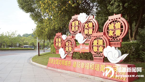 如今,在市區廣場、公園、路燈柱、建筑圍擋、公交站臺等地,市民抬頭便可見公益廣告。特別是遍布公園、主干道的公益廣告景觀小品,將公益廣告與恐龍文化、山水文化、客家文化等河源特色文化元素結合,得到了群眾的廣泛好評。市民黃先生說,市區這些公益廣告融合了河源本土文化特色,既美化了居住的環境,也起到了很好的教育引導作用。