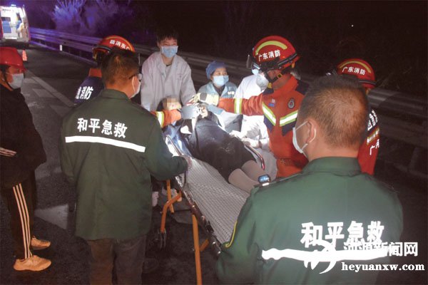 近日,粵贛高速往河源方向距和平兩公里發生一起交通事故,有人被困。和平縣陽明消防救援站指戰員到達現場后,發現一輛小車被夾在兩輛貨車之間,車頭嚴重變形,兩人被困。經過40分鐘的緊張救援,指戰員將兩名被困人員救出,并移交120醫護人員。