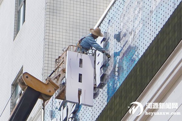 施工師傅經(jīng)受住高溫的“考驗(yàn)”,正在作業(yè)車上更換酒店招牌。