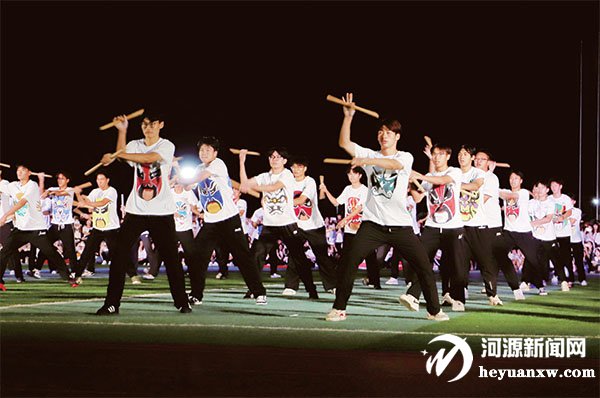 廣東技術師范大學河源校區體育運動會開幕式上,體育與健康學院學生演繹“民族戰舞·潮陽英歌舞”。