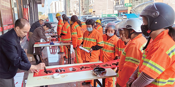 近日,市區愛心企業家羅燕強組織邀請了郭振強、肖志遠、鄧葵花等多名書法家和書法愛好者,為周邊街道的環衛工人義寫春聯。除此之外,該愛心企業當天還為現場的數十名環衛工人贈送了米、面等一批慰問品。記者了解到,截至日前,這家愛心企業已為包括環衛工人在內的市民贈送春聯超過1300副。