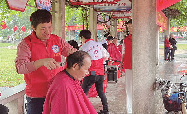 在社區、鄉村、企業,張理青提著工具箱,帶著滿滿的愛心去到有需要的人身旁,用手中飛舞的剪刀,為老人、小孩、特殊群體等“剪”出他們的笑容,“剪”出自己的愛心與奉獻。作為河源市逸家公益服務中心的一線執行隊長兼理事,張理青以身作則,積極號召張臣制造理發室的店員加入到志愿服務當中。在他的影響與積極帶動下,張臣制造理發室的店員都加入了公益服務中心,一起用自己的技藝奉獻愛心,為社會作貢獻。