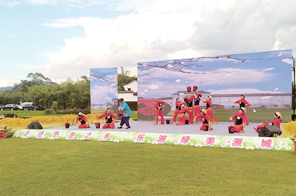 活動在火熱廣場舞《山歌唱進新時代》中拉開了序幕。整場節(jié)目豐富多彩、形式多樣,有舞蹈、快板、獨唱、器樂合奏、歌舞等節(jié)目形式。其中,歌曲《我的家鄉(xiāng)多么美》帶觀眾領略源城優(yōu)美的山水畫卷,舞蹈《客家娘酒》充分展示源城濃厚的傳統(tǒng)客家文化,歌曲《夢里東江》唱響了源城人民對一江清水的熱愛,器樂合奏《小城謠》繪出了源城人與自然和諧共生的美麗畫卷,男聲獨唱《你的名字叫恐龍》唱響河源“中華恐龍之鄉(xiāng)”的品牌。精彩紛呈的節(jié)目為廣大游客觀眾呈現(xiàn)出一場精美絕倫的群眾文藝盛宴。