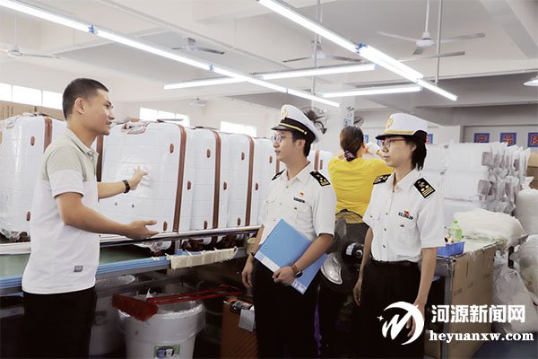 河源海關(guān)關(guān)員到箱包出口企業(yè)調(diào)研。