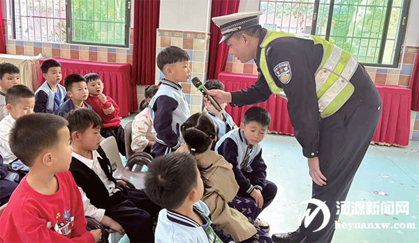 “法治進校園”宣傳活動中,民警與孩子在互動。
