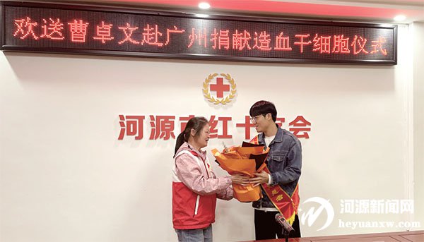 本報訊 記者 曹志成 通訊員 盧一藍 近日,河源又一例造血干細胞捐獻者曹卓文赴廣州進行造血干細胞捐獻,市紅十字會工作人員及志愿者為他舉行了歡送儀式。據了解,曹卓文預計于3月19日采集造血干細胞,用于救助一名血液病患者。他是我市今年第2例捐獻者,也是全市第24例造血干細胞捐獻者。