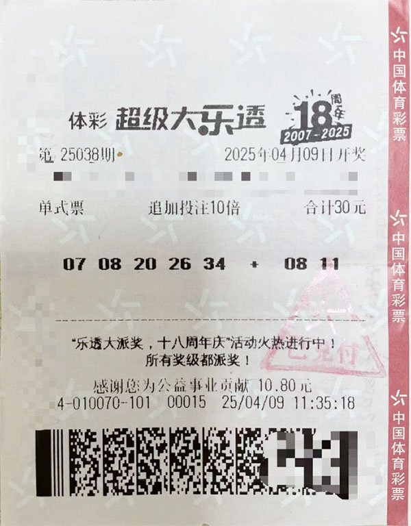 據(jù)了解,中獎(jiǎng)彩票出自河源市龍川縣老隆鎮(zhèn)新城區(qū)登峰路78號(hào)4414010070體彩實(shí)體店,為一張單式追加10倍投注的彩票,投注金額30元。當(dāng)期開獎(jiǎng)號(hào)碼前區(qū)為“07、08、20、26、34”,后區(qū)為“08、09”。中獎(jiǎng)?wù)咭詸C(jī)選方式完成投注,前區(qū)號(hào)碼“07、08、20、26、34”與開獎(jiǎng)號(hào)碼完全匹配,后區(qū)號(hào)碼“08、11”中得“08”,最終成功擊中二等獎(jiǎng)。