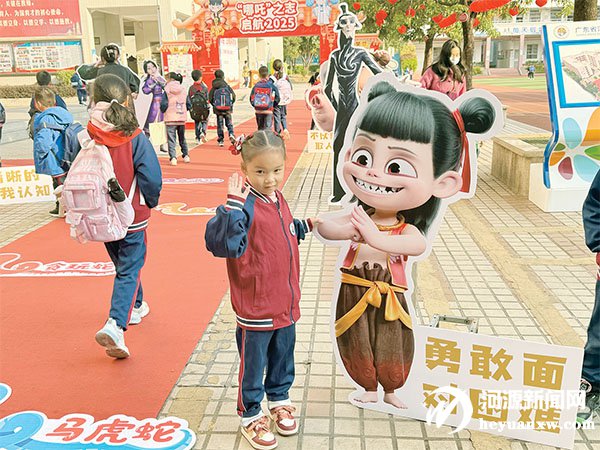 早上8時,當河源市第二小學的學生們歡快地踏入校門時,校領導們早已在校門口等候,熱情地向學生們發放開學“紅包”。開學“紅包”除了裝有祝福語,還有領讀券、免背誦券、管紀律券等趣味券,以及與校長共餐券、免作業券、限時同桌券等特別獎勵。等學生接過開學“紅包”,他們的目光瞬間被一道亮麗的風景線吸引——“哇!是哪吒!”一個身著紅肚兜、手持乾坤圈的小哪吒卡通形象立在校門口,引得學生們一陣驚呼,不少學生興奮地拉著家長的手,喊道:“媽媽,我要和哪吒合影!”記者看到,步入校園,校道上五個以“拖延蛇”“馬虎蛇”“貪玩蛇”“依賴蛇”“自滿蛇”等命名的跨欄牌依次排列,學生一一跨過,便寓意著在新學期能夠勇往直前,克服困難。同時,寫著“‘哪吒’之志啟航2025”的哪吒主題門矗立在校道入口,門前還有《哪吒2》中主要角色的卡通形象展板整齊排列,對應寫著清晰的自我認知、家庭陪伴、正確交友、勇敢面對困難等標語,吸引學生駐足觀看。門口兩側的許愿區已經貼滿了五彩斑斕的愿望卡,“我希望我能在新學年里更加勇敢自信”“祝爸爸媽媽永遠年輕”“祝大家天天開心”……每一張卡片上都承載著孩子們對新學期的美好祝愿和期待。