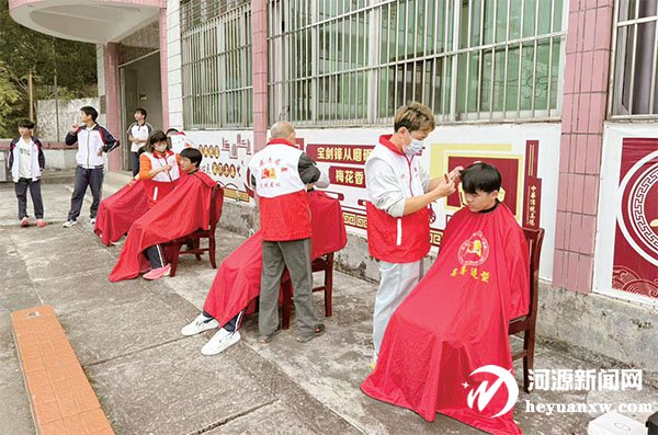 龍川縣“益剪暖龍川 愛心傳萬家”文明實踐活動中,志愿者為學生義剪。