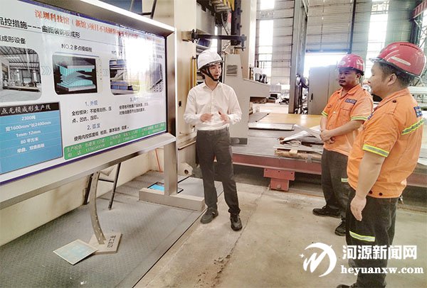 廖東帆(左一)在車間了解一線工人開展項目生產情況。