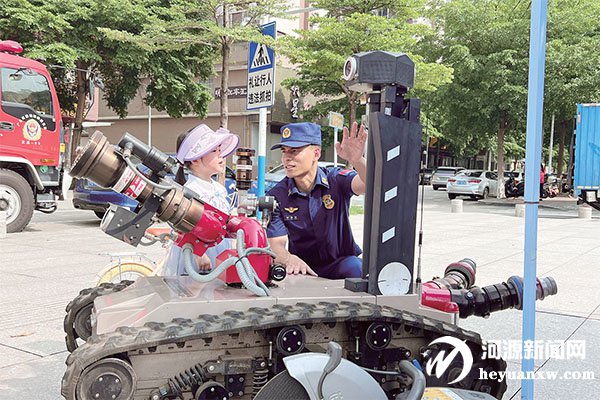 小朋友參觀河源市應急救援隊的專業(yè)設備。