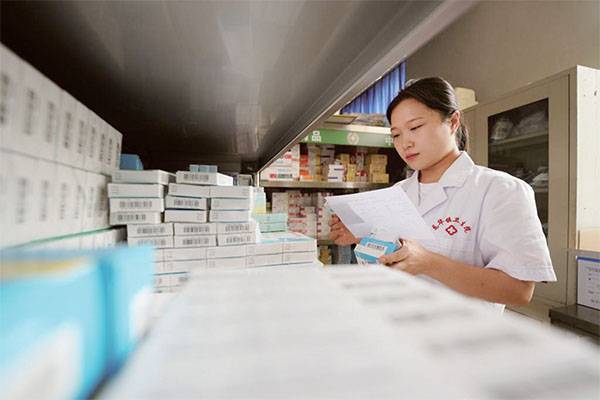 河北省柏鄉縣龍華鎮衛生院藥房工作人員在為患者取藥。
