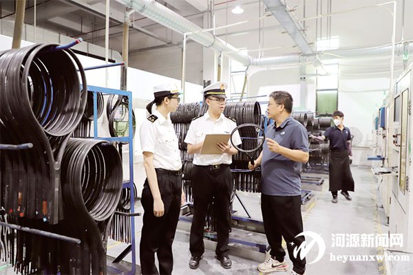 河源海關(guān)關(guān)員到球拍生產(chǎn)企業(yè)調(diào)研。